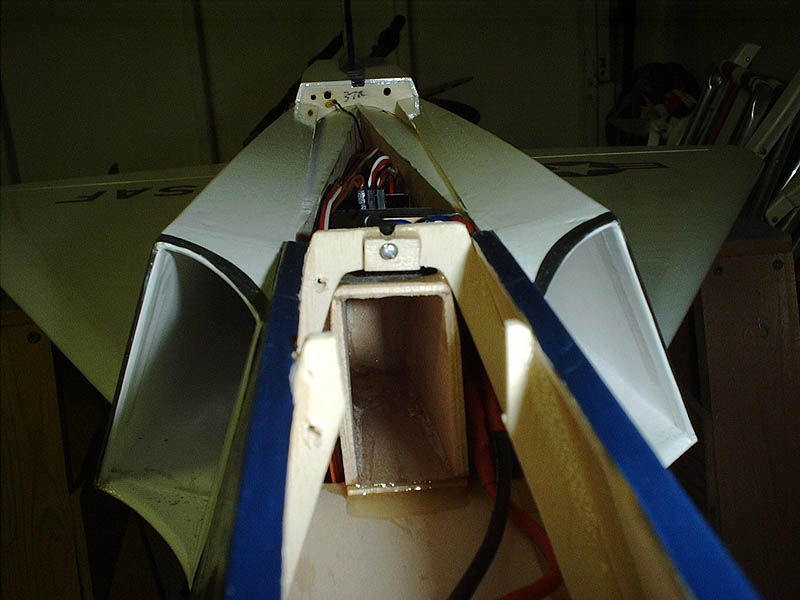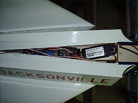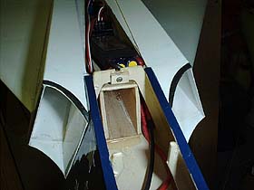 The placement of the components was determined after the model was constructed so that no additional ballast would be required to balance the model. The model could accomodate a 10-cell CP-1700SCR pack if a slightly longer battery box were constructed. These components were originally going to be placed in the cockpit section, but doing so would have made the model extremely nose-heavy and required a fair amount of lead in the tail area in order keep it in balance. After initial competition flights were completed, I replaced the Kyosho AP-29L motor and AstroFlight 217D speed controller with a Hacker B40-10S motor and a Jeti Master 70-3P Opto brushless speed controller. I am still using the same 10-cell battery pack. The Hacker motor is slightly heavier than the Kyosho and the Jeti controller is heavier than the AstroFlight. The Jeti is in the same location as the AstroFlight. |