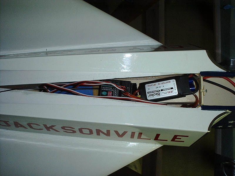 In order for the model to balance properly, the Hitec 555 receiver, 4-cell, 270mAh receiver battery pack, Jeti Master 70-3P Opto brushless speed controller, and 10-cell CP-1300SCR flight pack had to be crammed into the area between the inlets. |